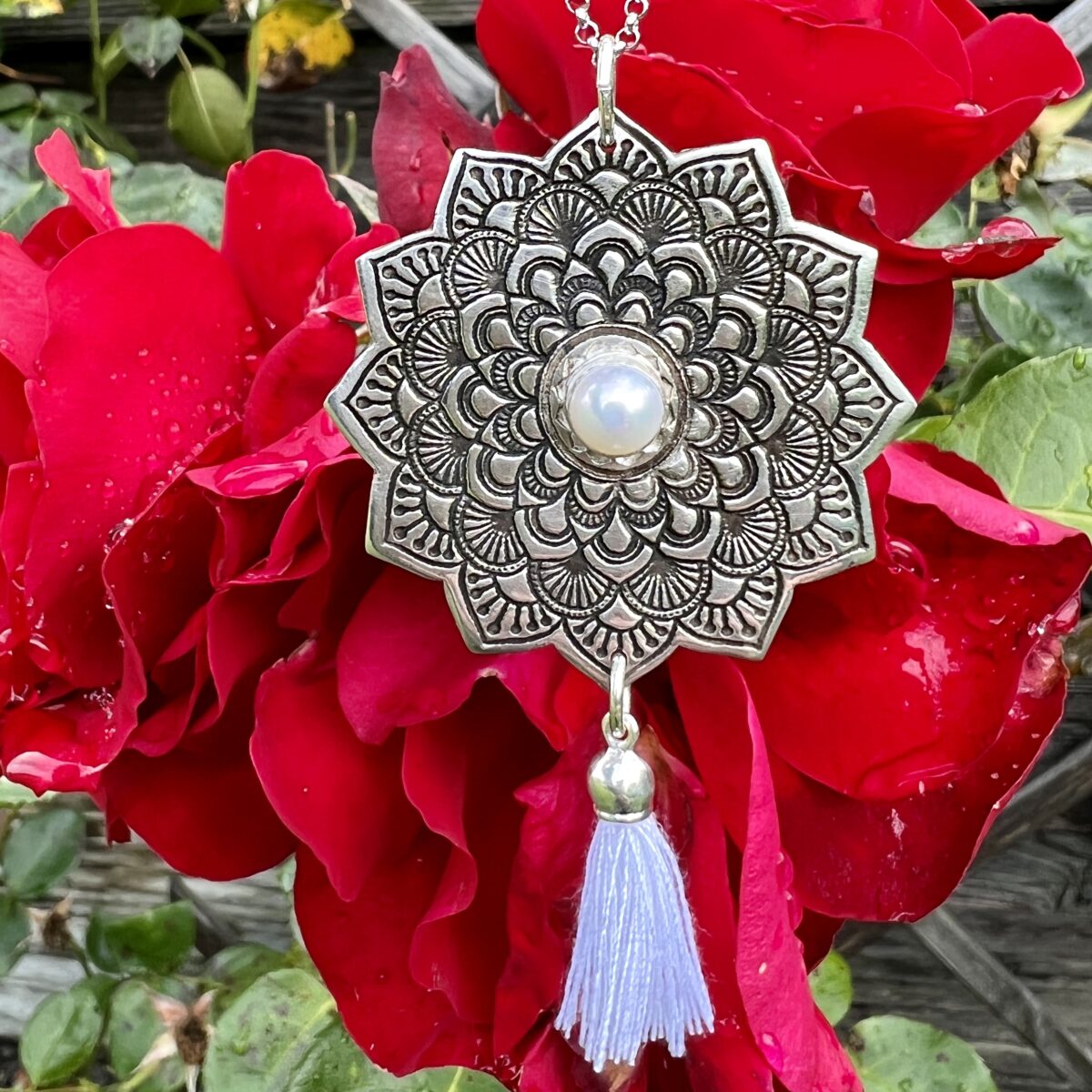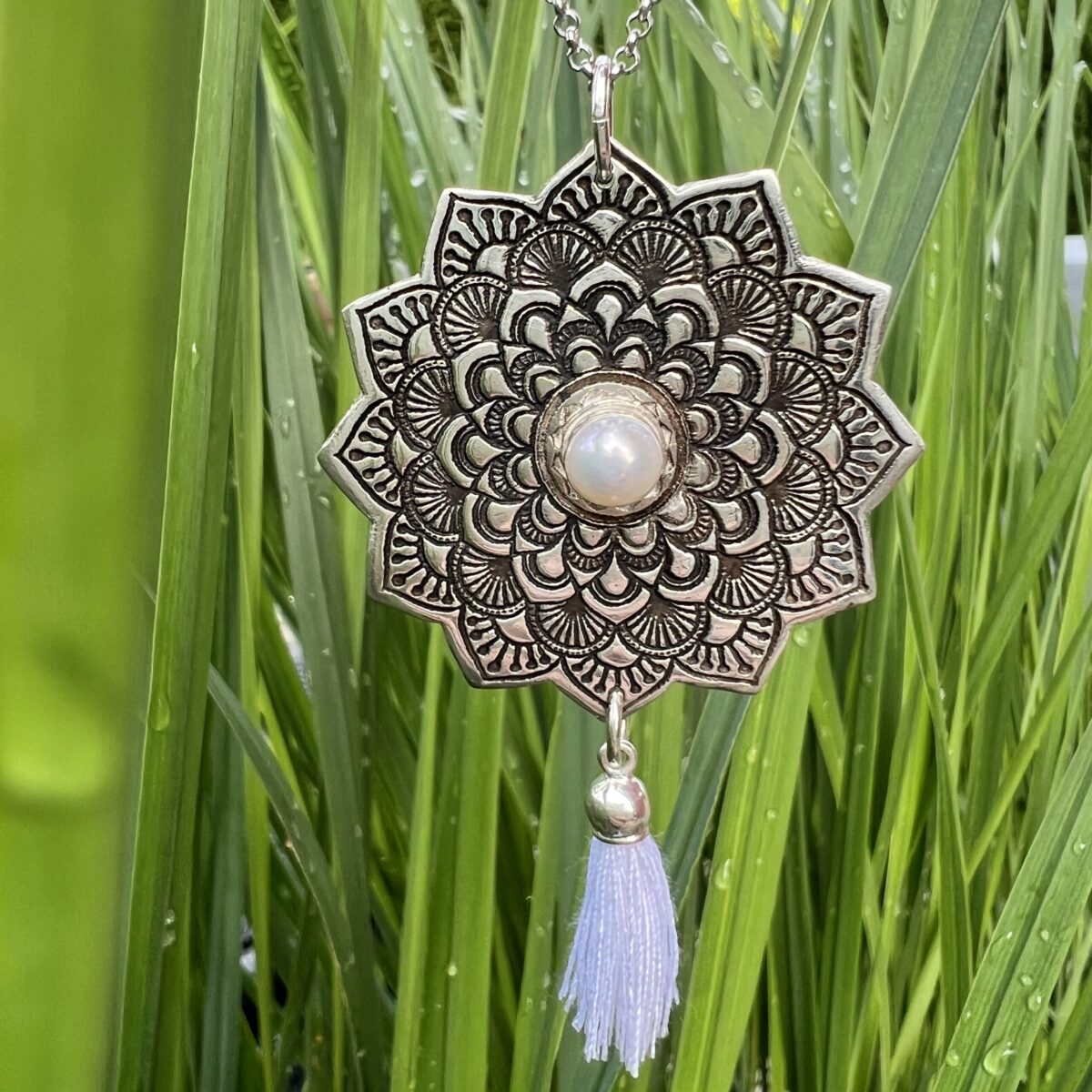 Dieser wunderschöne, handgemachten Anhänger aus Silber  wurde liebevoll von Simone Wyss hergestellt. In der Mitte des Anhängers ist eine weisse Süsswasser Zuchtperle. Den Silberanhänger kannst du an deine Mala Kette machen (mit dem Silberbiegering) oder du kannst den Silberanhänger an eine Silberkette machen.
