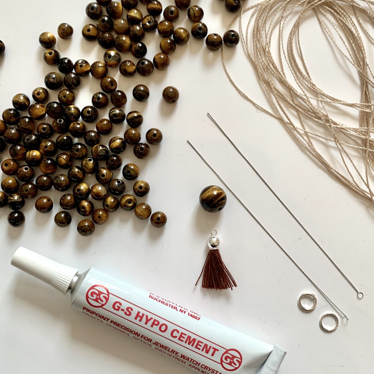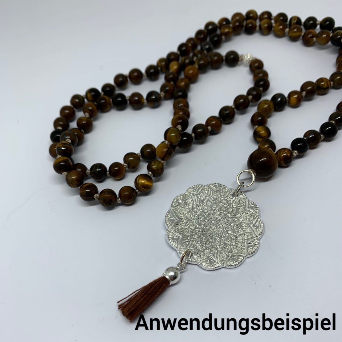 Mit diesem Set kannst du deine Mala Kette selber knüpfen und hast alles dabei was du brauchst. 108 Edelsteine (es sind immer etwas mehr dabei, damit du etwas Reserve hast falls es welche dabei hat die nicht schön gebohrt sind), 1 Guru Perle, 2 Perlnadeln, 4,5m Garn zum Knüpfen in der passenden Farbe zum Edelstein, 1 Quaste mit Silberaufhängung, 1 geschlossenes Silberringli, 1 offenes Silberringli und einen Schmuckkleber.